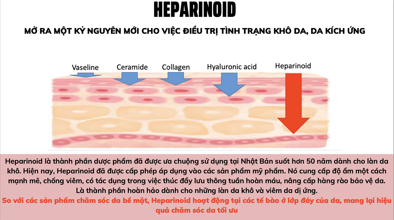 Heparinoid là một hoạt chất được các bác sĩ da liễu ở Nhật Bản ưa thích trong suốt 50 năm liền. Được sản xuất từ các dẫn xuất của heparin, heparinoid thường được sử dụng trong ngành công nghiệp mỹ phẩm và chăm sóc da.